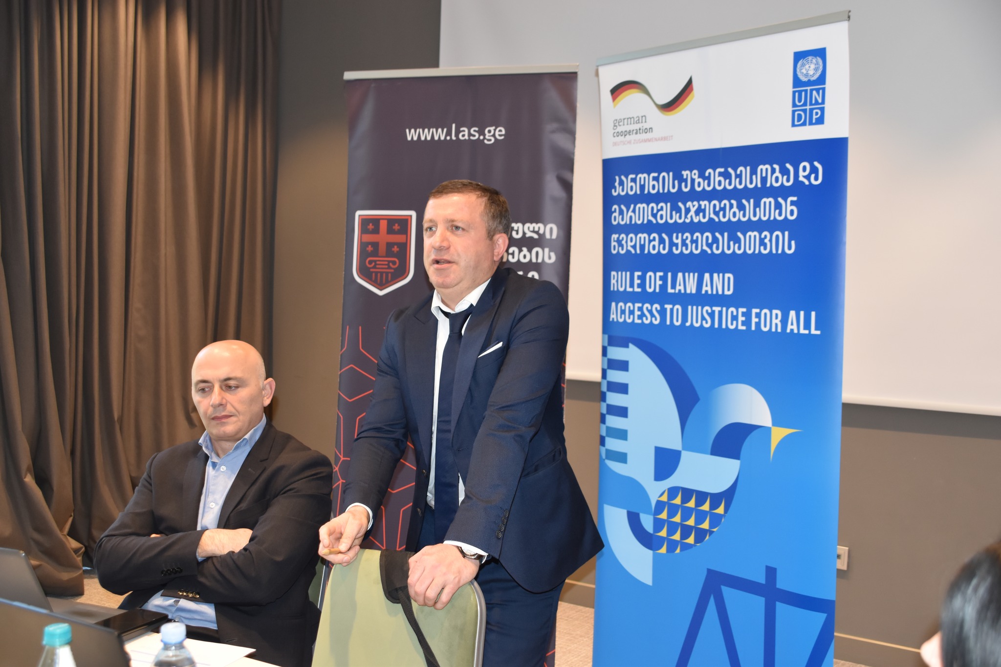 The Legal Aid Service (LAS) staff and invited members of the Public Advocates' Registry received training on "Jury Selection" in Tbilisi on October 28, 2025. United Nations Development Program (UNDP) Coordinator Levan Asatiani opened the event. Public attorneys Gela Siordia, Head of the Bureau of Particularly Important Cases of West Georgia, and Sulkhan Komakhidze, Head of the Bureau of Particularly Important Cases of East Georgia, led the training. Both attorneys have substantial expertise in jury trials.